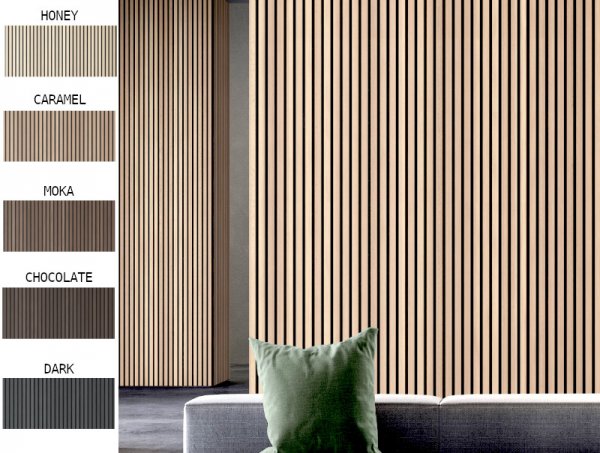 Pannello fonoassorbente acustico in listelli di legno, realizzati in fibra di poliestere accoppiata a MDF impiallacciato con una lamina in puro legno naturale.