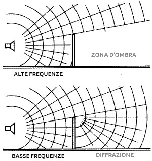 Il fenomeno della diffrazione del suono ci fa capire sostanzialmente una cosa: che a parità di dimensioni dell'ostacolo che incontrano, i suoni con basse frequenze (maggior lunghezza d'onda), cioè quelli più gravi, sono in grado di aggirare più facilmente gli ostacoli. Non solo. Se la barriera presenta dei bordi con spigoli vivi, questi diveneteranno essi stessi delle sorgenti. Viceversa i suoni più acuti, cioè quelli con alte frequenze (minor lughezza d'onda), troveranno una barriera, creando al di la dell'ostacolo stesso una zona d'ombra, cioè una zona priva di suono. Se vogliamo trasferire nella pratica quanto detto, se un giorno dovessimo costruire un muro tra noi ed una sorgente per ostacolarne l'onda sonora, lo costruiremo senza dubbio più alto se si tratta di un suono grave, più basso se acuto.
