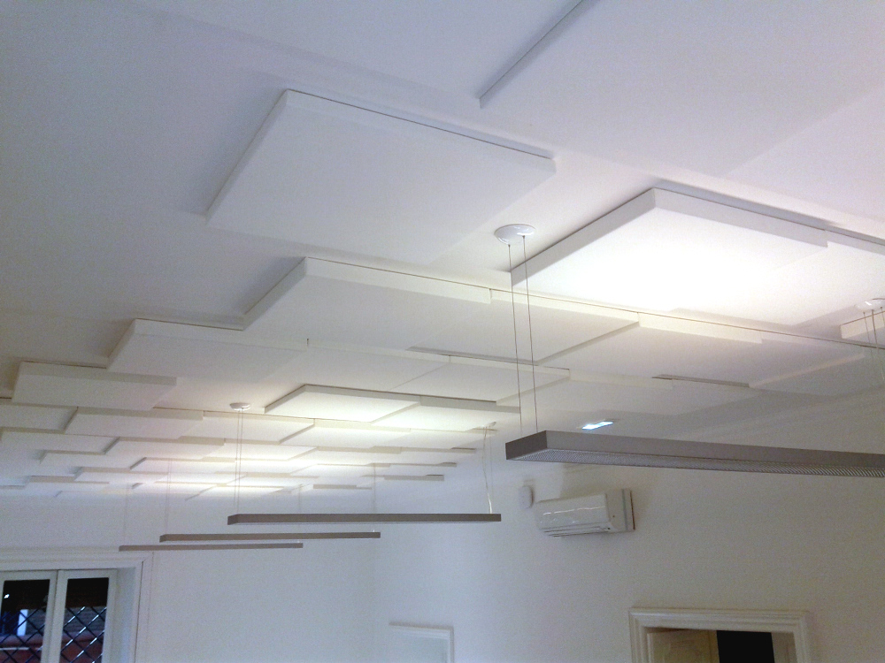 Il trattamento ha previsto il posizionamento di 124 pannelli fonoassorbenti Polywall Design da 600x600 mm, 62 con spessore 30 mm e 62 50 mm. I pannell sono ricoperti di un tessuto bianco che non ne limita le funzioni fonoassorbenti. Diventano in questo modo un elemento decorativo funzionale che si associa alla progettazione architettonica.